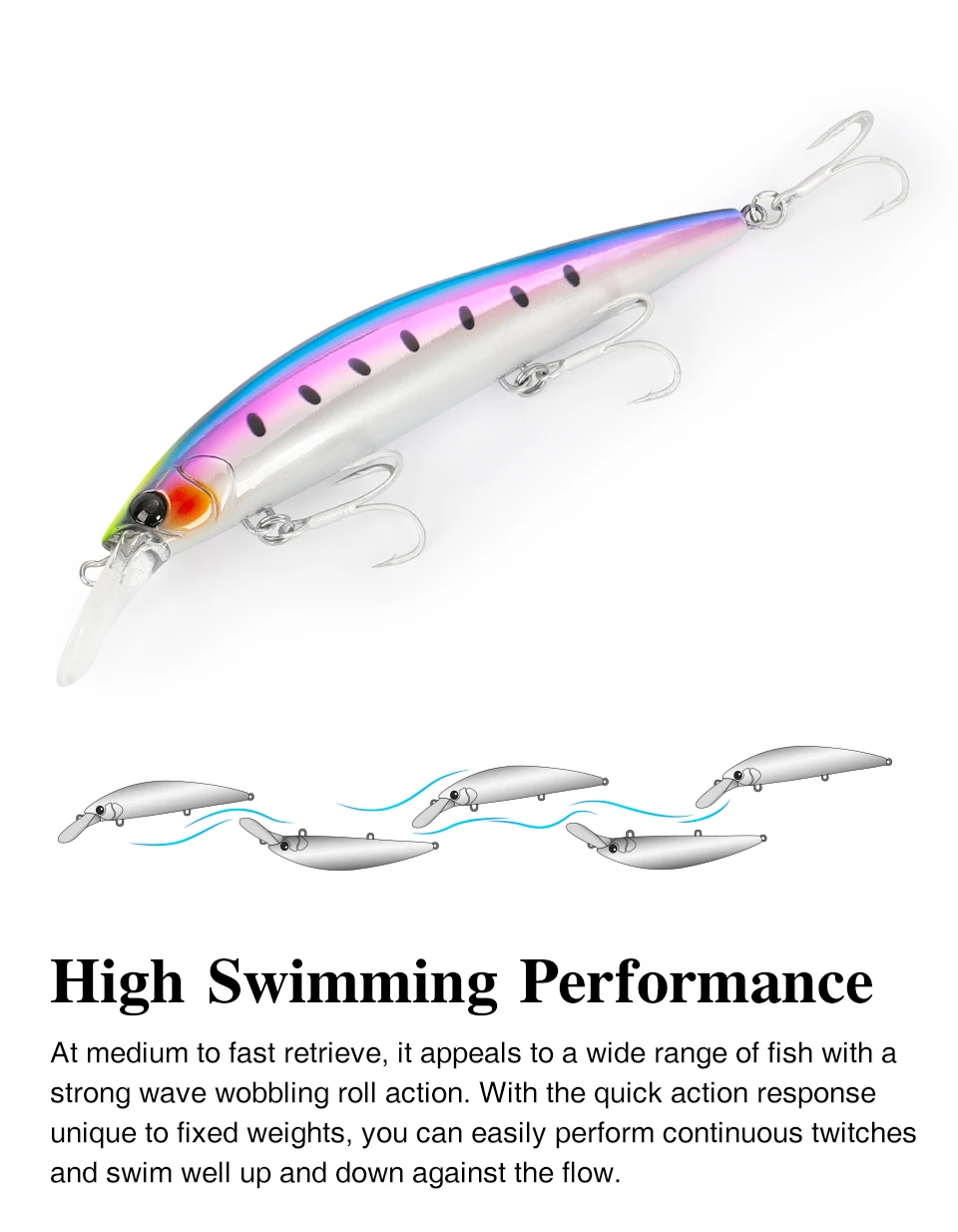 Com recuperação média a rápida, atrai vários peixes com uma forte ação de rolamento oscilante.Com a resposta de ação rápida exclusiva aos pesos fixos, ele pode facilmente realizar contrações contínuas e nadar bem para cima e para baixo contra o fluxo.